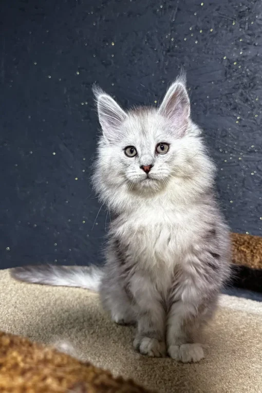 Hello! I’m Melody, a sweet and playful 11-week-old Maine Coon kitten, and I can’t wait to join your family. My black smoke agouti coat is super shiny, and my bright green eyes will definitely captivate you. But I’m not just a pretty face—I’m also clever, curious, and love exploring! I’m already a little adventurer who can open doors, and I’m quick to learn new things, whether it’s finding my favorite toys or solving fun puzzles.
