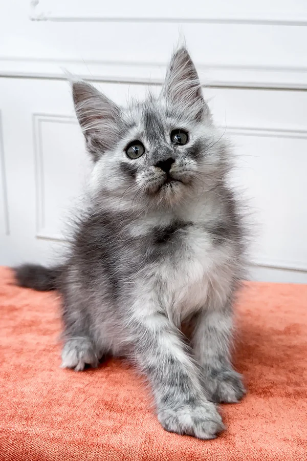 Meet Irene, an exquisite female maine coon with a striking black smoke coat and mesmerizing gold eyes. Her big ears and chic fur make her a highly desired companion for any cat lover. Irene’s rare bloodlines and excellent breed type add to her allure. Despite a slight cosmetic bend in her tail, she is in perfect health and loves to be around people. At an adult size of approximately 12-16 lbs, she is playful and gentle, currently enjoying Savori Kitten food. Irene is litter-trained and spayed, ready to bring joy and elegance to her new home. Don’t miss the chance to welcome this impressive and luxurious kitten into your life. Adopt Irene and make her a cherished part of your family!