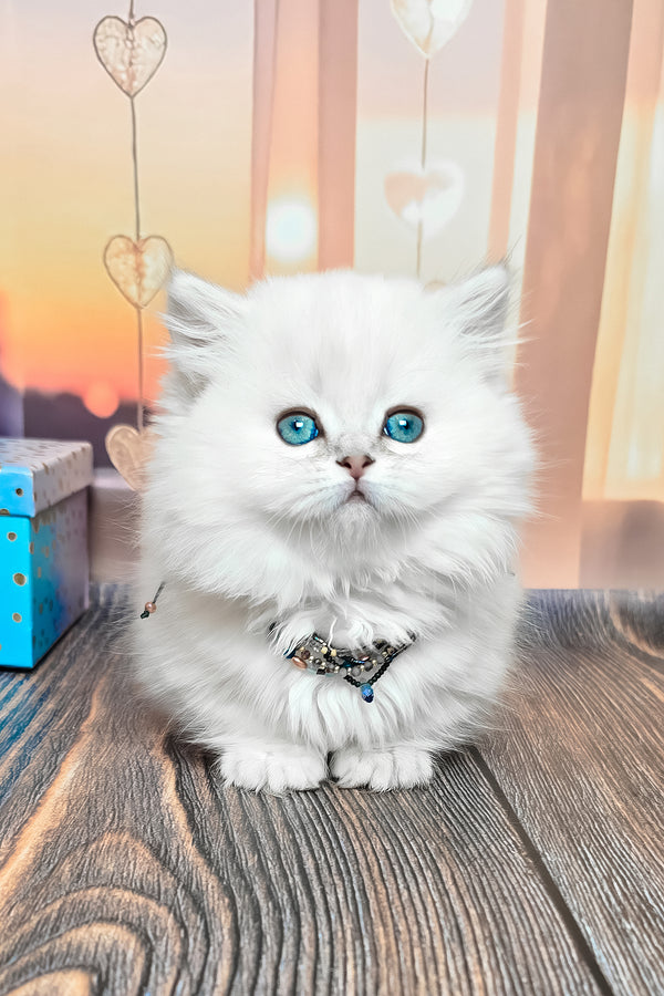 Hello, my name is Pamela, a charming Munchkin Longhair girl with a delicate blue silver shaded point coat and beautiful blue eyes. My fur is long, silky, and shiny, with soft silver tones and gentle shading that give me a refined and elegant appearance. My short little legs make me especially unique and adorable, adding to my sweet and compact look. My expressive eyes are one of my most captivating features, they are bright, deep, and full of emotion. I eat Purina Pro Plan Kitten to support my healthy growth and keep my coat soft and glossy.