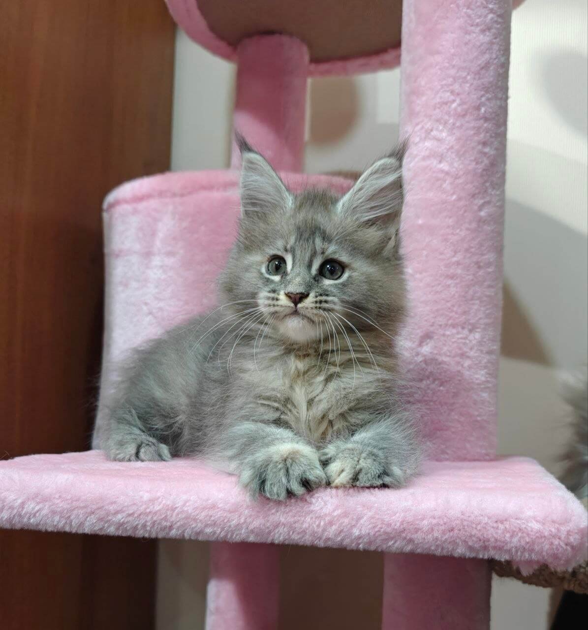 Kelly is a regal Maine Coon female kitten with a luxurious, fluffy coat and striking, adventurous eyes. Full of playful energy, he thrives on exploring, climbing, and pouncing like a true little king. Yet, beneath his bold nature, Kelly is also incredibly affectionate and loves to curl up for warm, cozy naps.